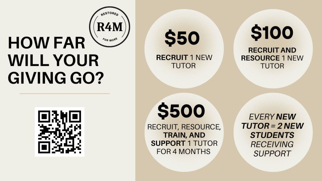 Restored For More supports local schools and non-profit organizations by sending volunteer tutors to work with students one on one in math and reading. We don’t want to put any unnecessary burden on these organizations so we don’t ask our schools to provide any of the resources our tutors use. We are looking for donations of books, leveled readers, school supplies, and notebooks.